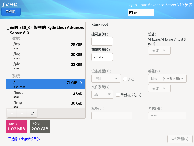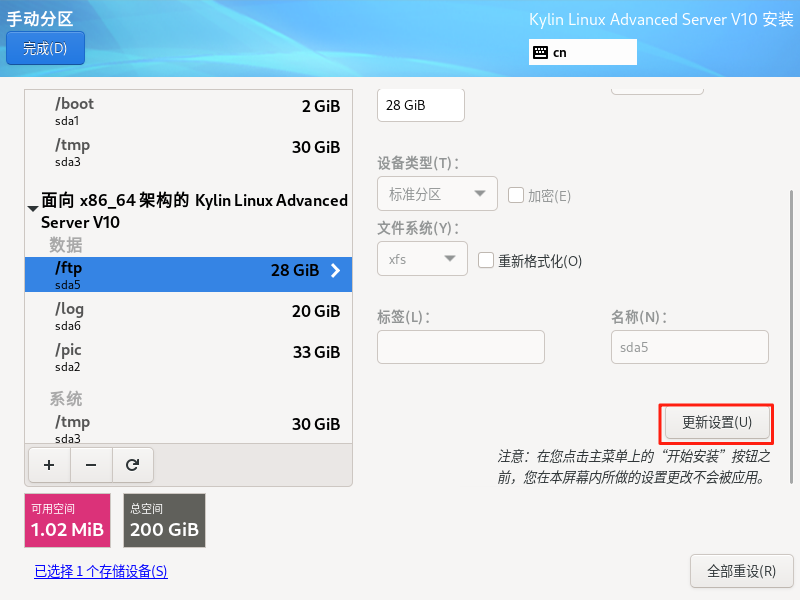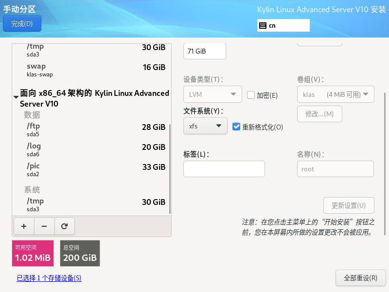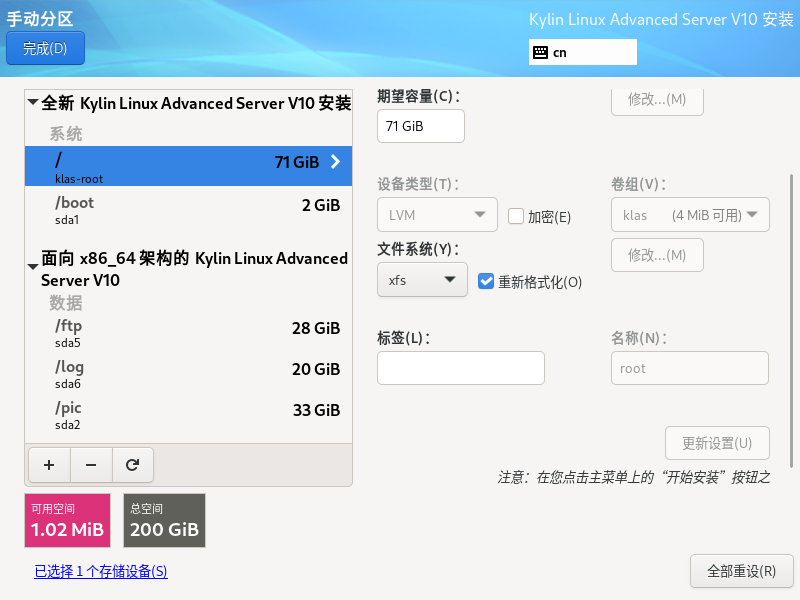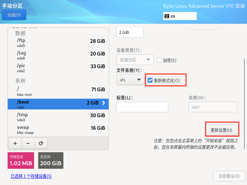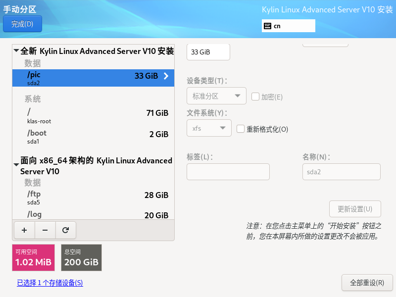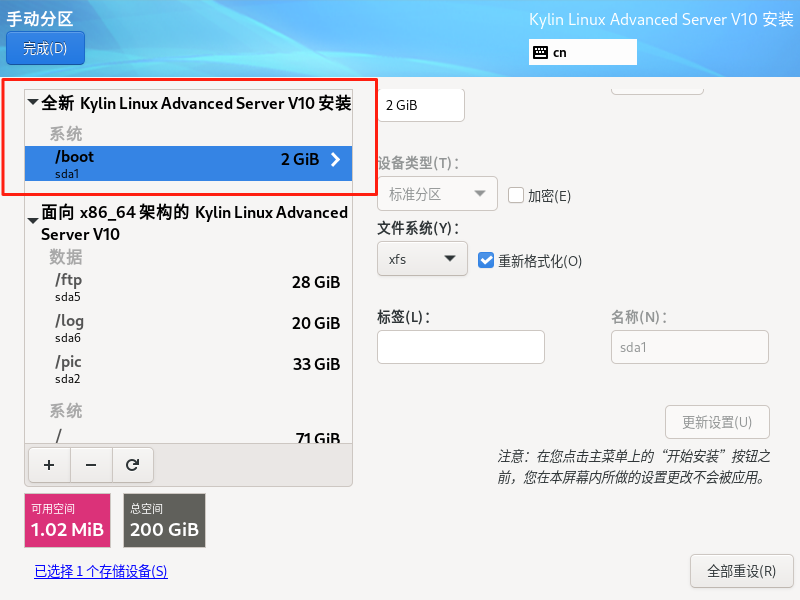 银河麒麟高级服务器操作系统保留数据盘重新安装系统(boot分区,efi,根分区必须格式化)