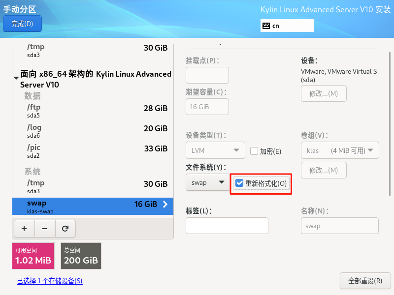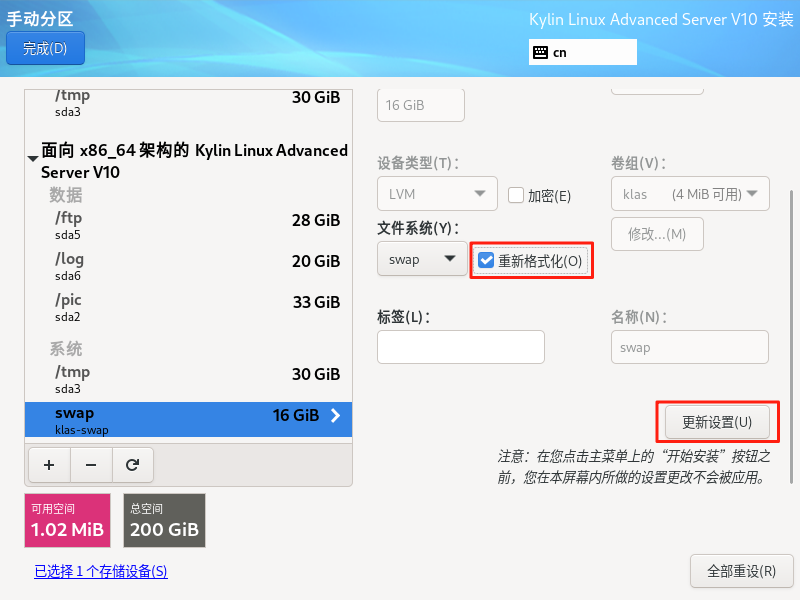 注意:/boot,/,swap,/boot/efi(如果没有则不用操作)等四个分区可以点击“重新格式化”,进行安装系统,其他数据盘,不要选择“重新格式化”。 arm架构有/boot/efi这个分区,所以需要格式化。