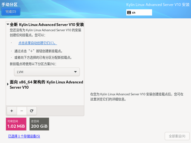 在“全新Kylin Linux Advanced Server V10安装”会有现在要安装的所有的发你去。 在“面向x86_64架构的Kylin Linux Advanced Server V10”里面会显示没有格式化分区的显示。
