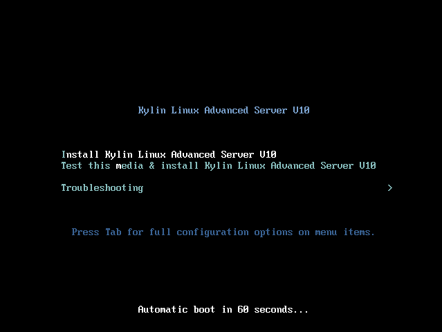 使用向上方向键↑选择“Install Kylin Linux Advanced Server V10”,按“Enter”进入安装配置界面。 默认就是选择“Install Kylin Linux Advanced Server V10”,等待60秒后会自动进入安装过程。
