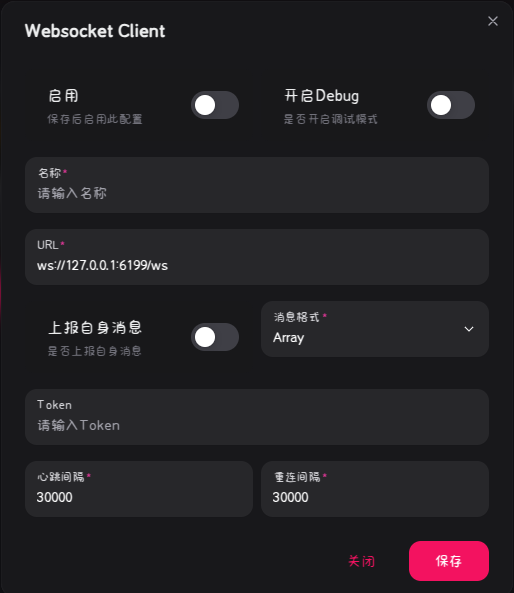 启用。 URL填写ws://宿主机IP:端口/ws。如ws://localhost:6199/ws或ws://127.0.0.1:6199/ws。- 消息格式: