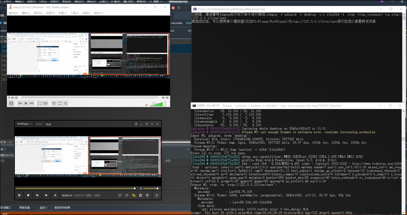 使用效果举例: 运行程序代码后,打开cmd,执行以下代码进行桌面推流: ffmpeg -f gdigrab -i desktop -c:v libx264 -f rtsp -