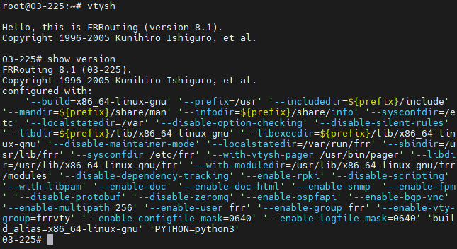 FRR提供了一个类似Cisco IOS的配置界面,让网络工程师能无缝上手。接下来,我们需要使用vtysh命令进入FRR的命令行交互界面进行配置。