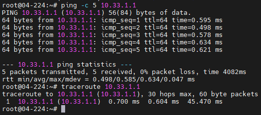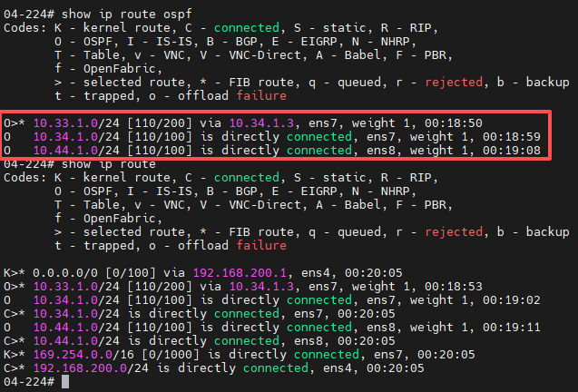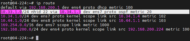可以看到,内核中也多了一条去往10.33.1.0/24的路由,下一跳为10.34.1.3,而且显示协议为ospf,比在vtysh显示的还好一些。