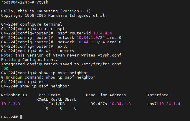 configure terminalrouter ospf ospf router-id 10.4.4.4 network 10.34.1.0/24 area 0 network 10.44.1.0/24 area 0 exitdo write memoryshow ip ospf neighbor