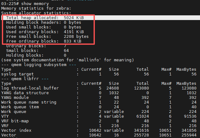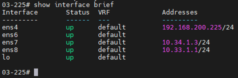 可以看到,FRR直接读取了设备的IP地址配置,无需单独配置。那我们接下来测试一下配置OSPF。指定Router ID,宣告直连网段,几个简单命令就完成了OSPF的基本配置。