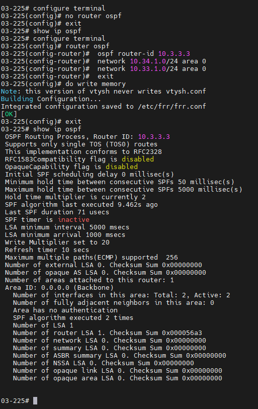 configure terminalrouter ospf ospf router-id 10.3.3.3 network 10.34.1.0/24 area 0 network 10.33.1.0/24 area 0 exitdo write memory