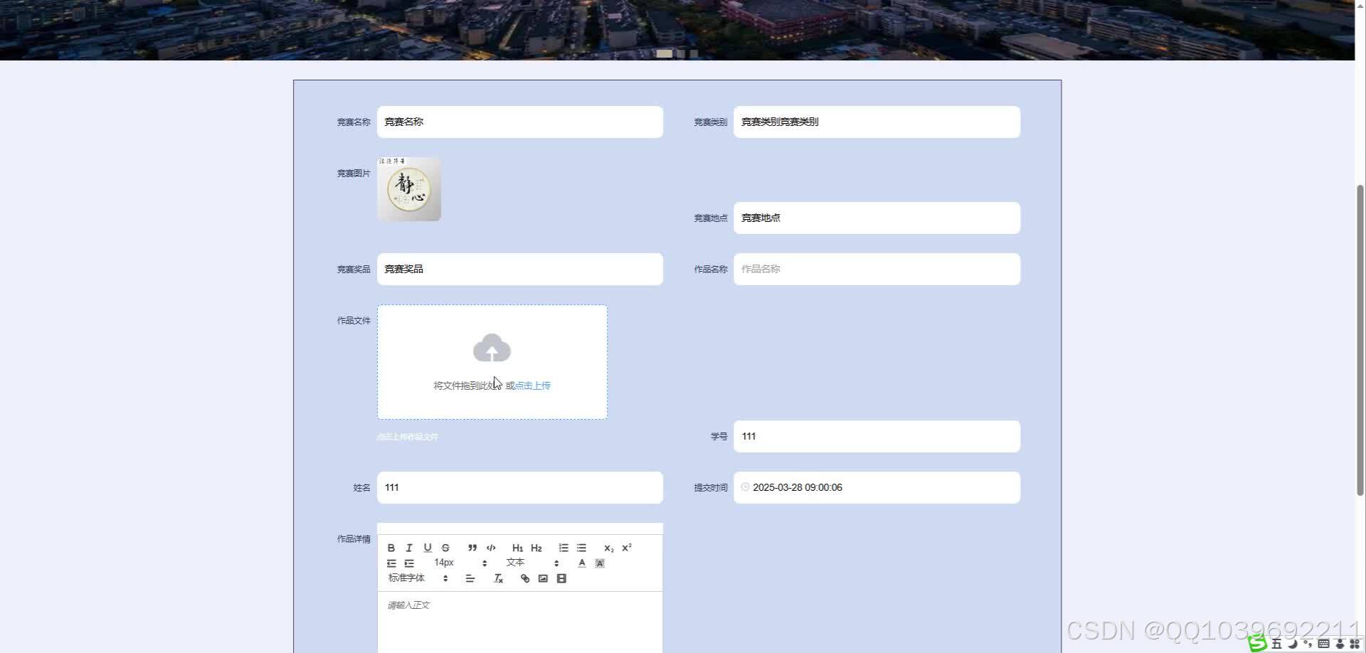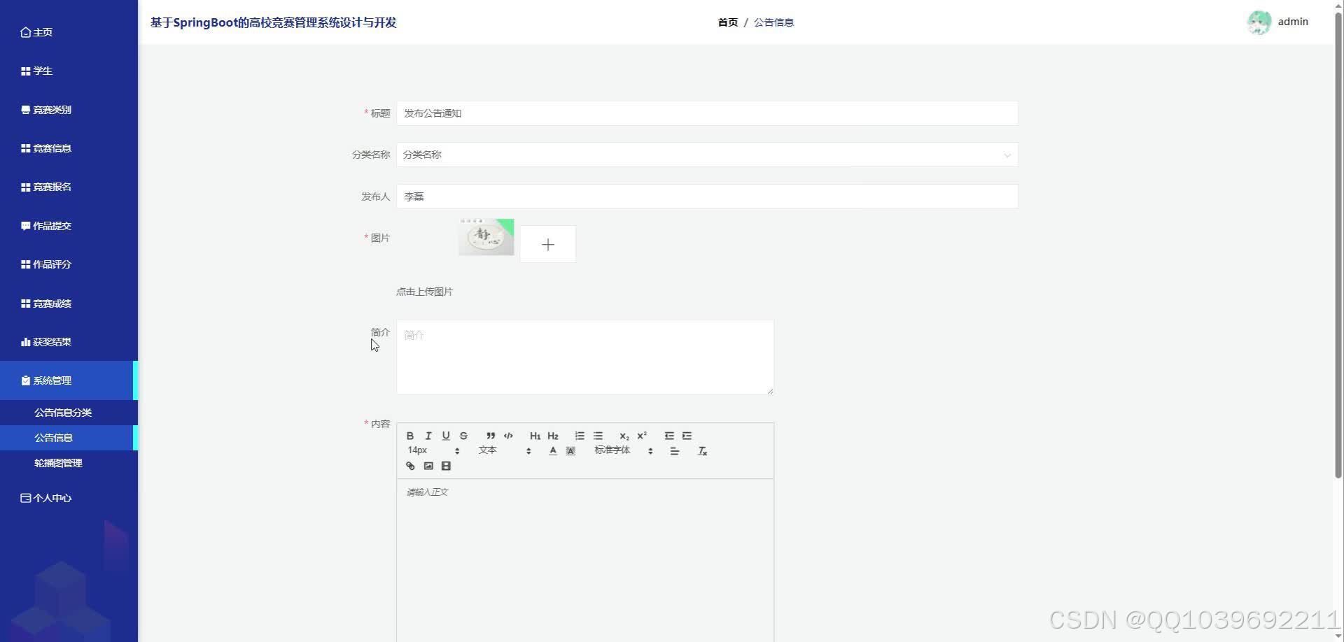 信息发布:支持竞赛名称、时间、地点、规则、奖项设置等信息的发布与修改。