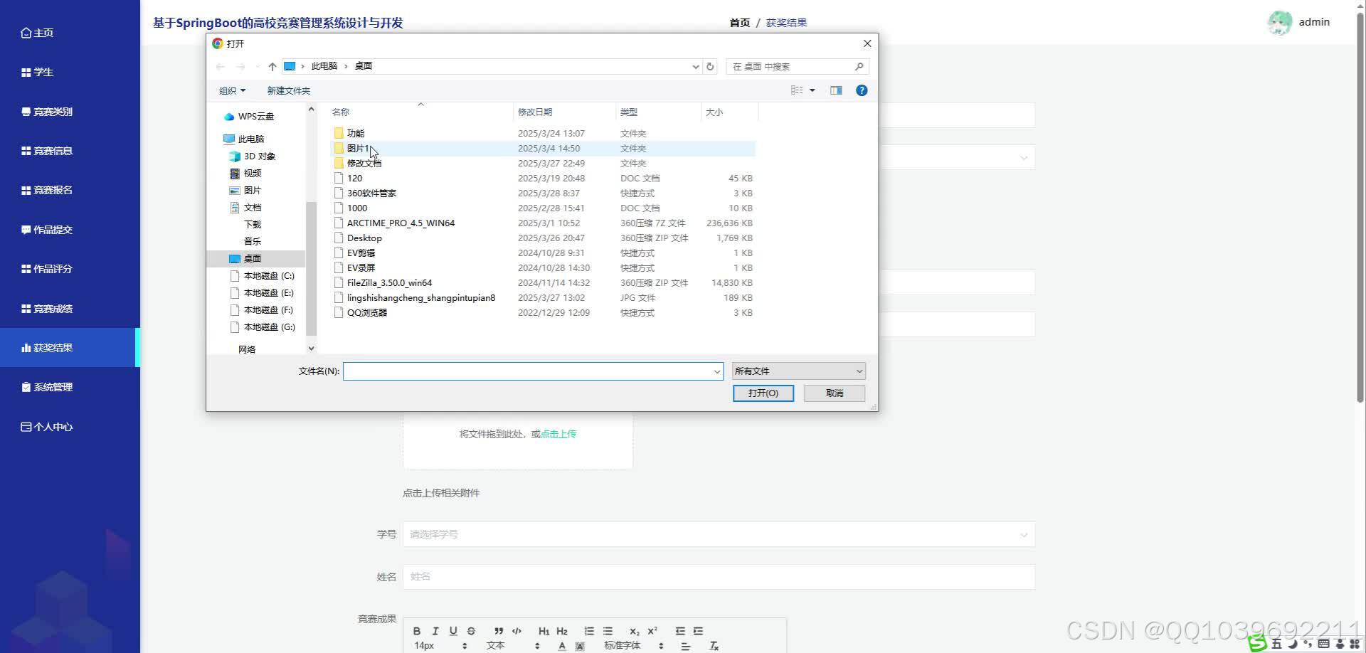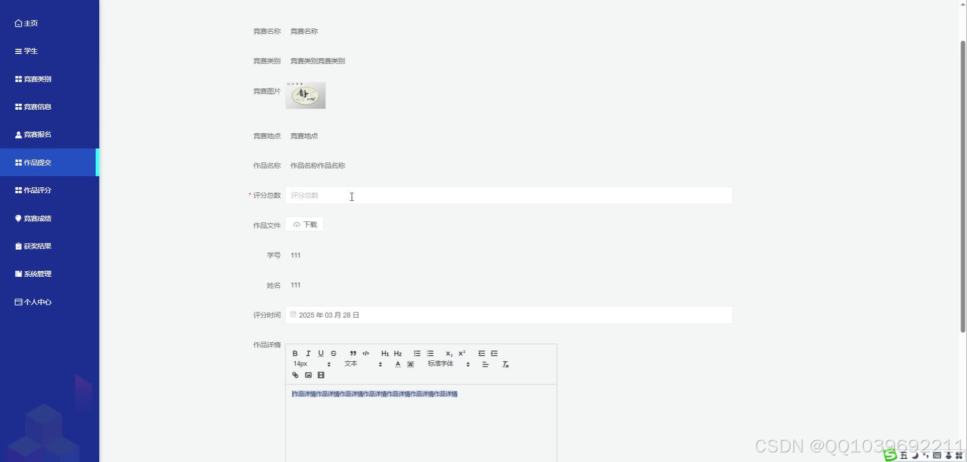 数据统计:生成参赛人数、获奖率、作品质量等报表,支持按时间、竞赛类型维度分析。
