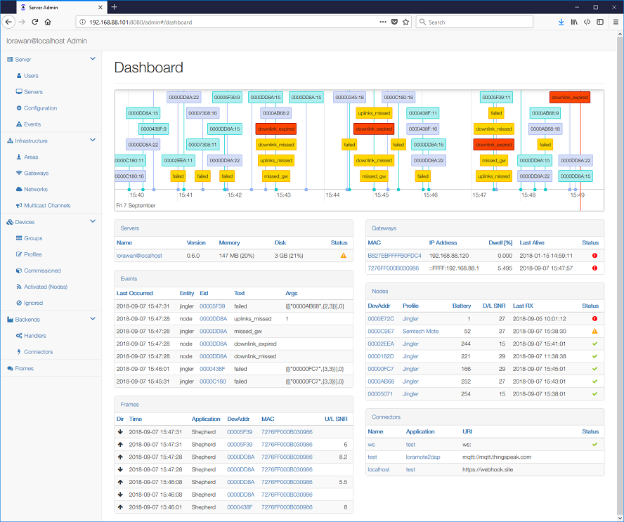 lorawan-server集成了网络服务器和应用服务器,支持LoRaWAN规范v1.0.3,为小型私有网络提供了一站式解决方案。