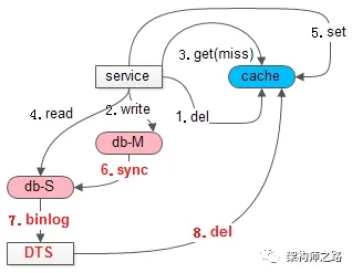 - (8)从库执行完写操作,向缓存再次发起删除,淘汰这段时间内可能写入缓存的旧数据;