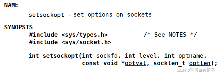 - 其实服务器如果中断,然后立即重启,会触发偶发性的重启失败,端口号无法绑定的问题,所以这里我们在服务器的初始化的时候,使用setsockopt这个接口就可以有效避免这种情况,setsockopt是作用是设置网络套接字的选项,所以依次传入网络文件描述符listensock_,然后level就是选择协议层,这里我们选择套接字层SOL_SOCKET,接下来就需要传入要设置的选项,那么这里我们设置重新使用IP地址,重新使用端口号即可SO_REUSEADDR|SO_REUSEPORT,optval即要设计选项的值,那么我们在本地定义一个值为1的opt然后取地址传入即可&opt,紧接着是传入这个变量的大小,即sizeof(opt)
