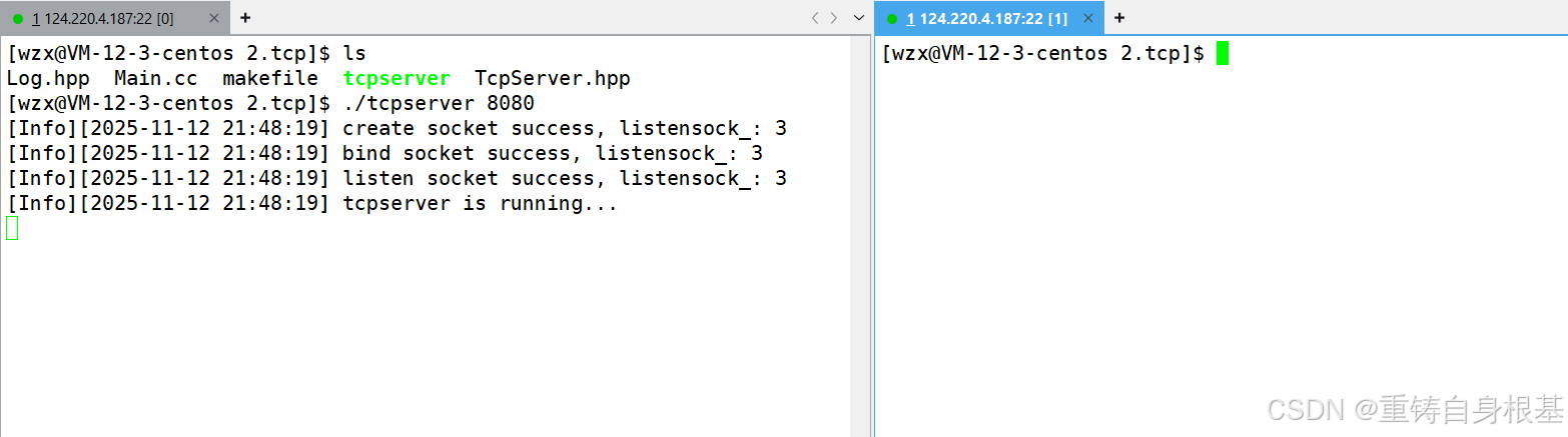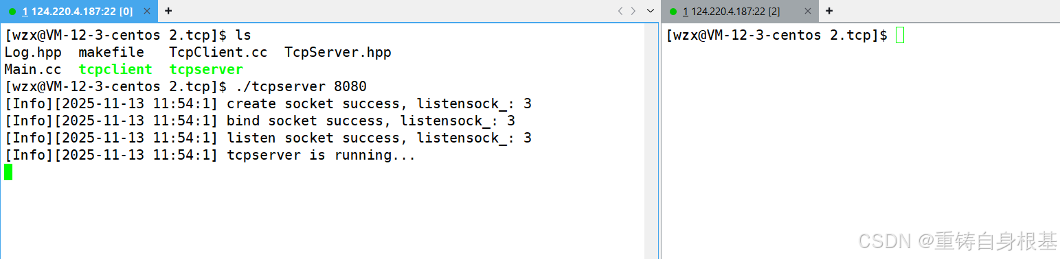 - 如果listen失败bind则会返回一个小于0的数,所以我们判断一下,如果listen监听失败,那么打印日志信息,然后终止服务器,如果listen监听成功,那么打印日志信息即可