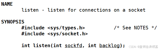 - 那么接下来就是使用listen将一个网络文件描述符对应的网络套接字设置为监听状态,那么依次传入网络文件描述符listensock_,然后再传入backlog,其中关于这个backlog我们在基本框架已经定义出来了,默认我们设置为10,表示允许这个服务器同时可以监听连接请求的最大数量,一般我们将其设置为10,并且不会将其设置为很大