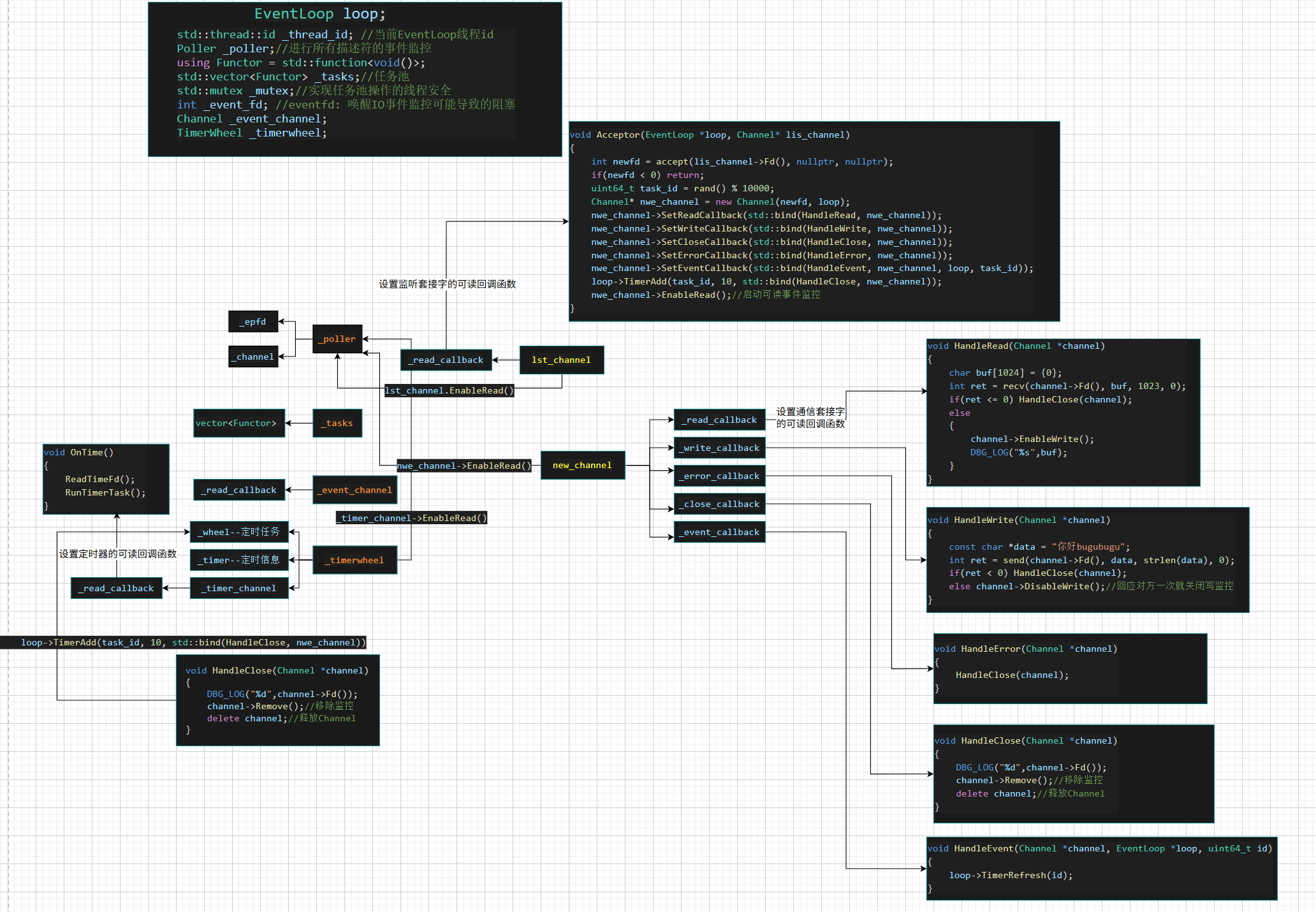 new_channel->SetReadCallback(std::bind(HandleRead, new_channel));//为通信套接字设置可读事件的回调函数