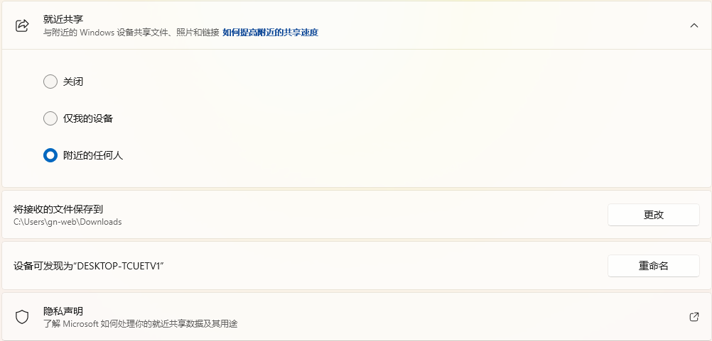 - 在两台电脑上,按下 Win + i键打开“设置”,点击“系统”,找到并选择“就近共享”,选择“所有人”以确保能互相发现。