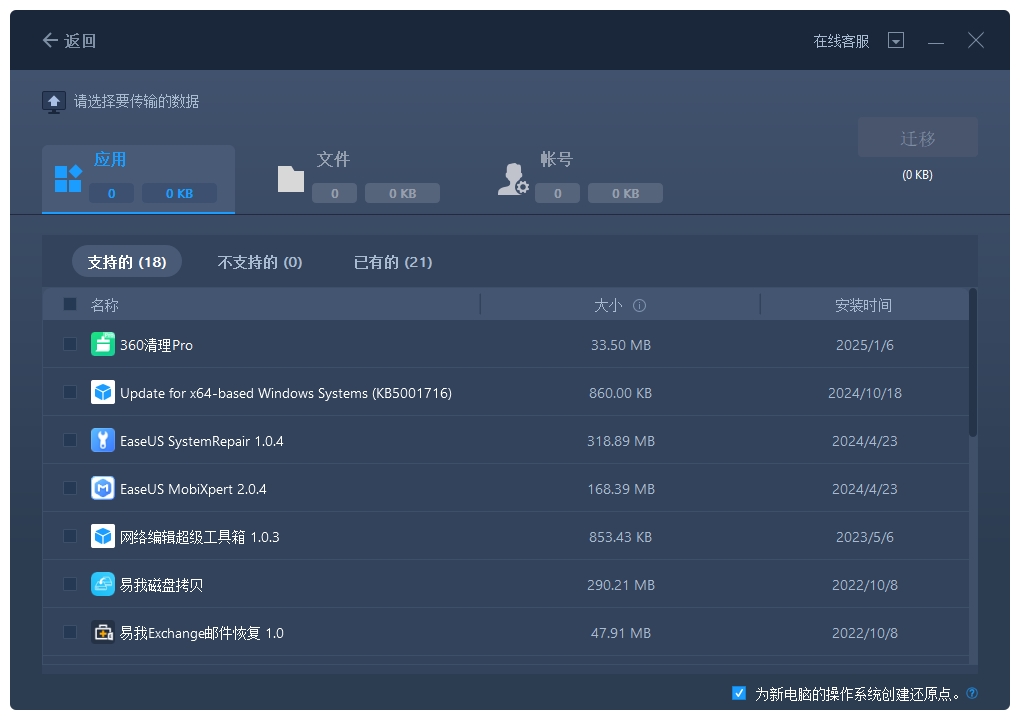 步骤3.此软件将开始进行分析并列举出电脑中所有可以传输的应用程序、文件和账号。此过程将花费一些时间,请耐心等待。