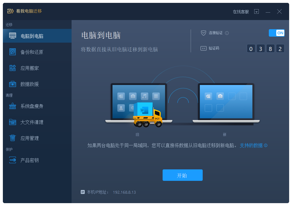 步骤1.启动传输工具,选择“电脑到电脑”,找到与之配对的电脑,完成验证,点击“连接”按钮进行连接。