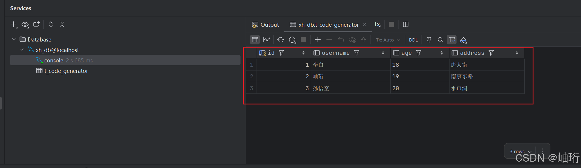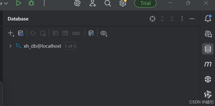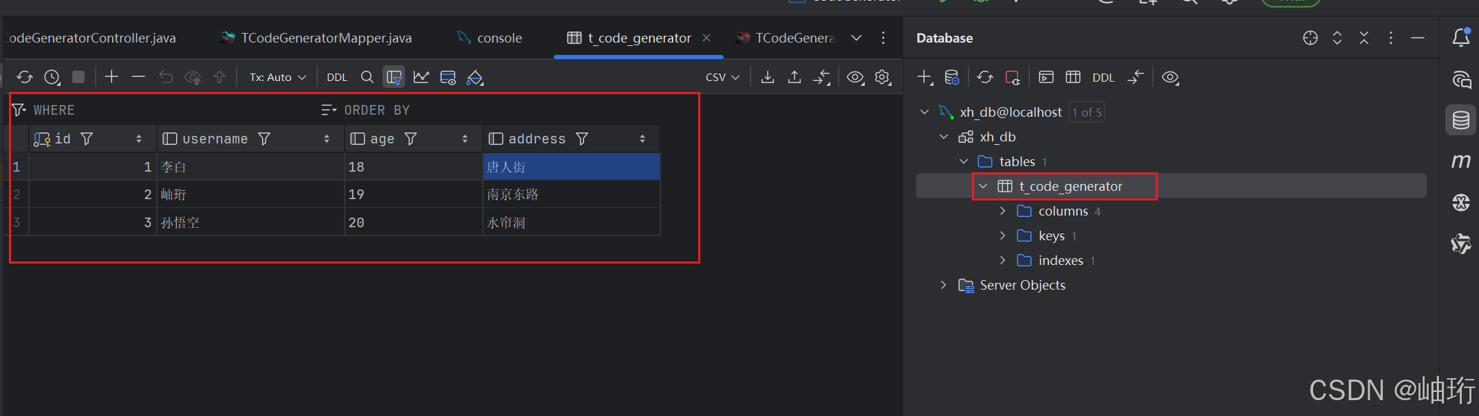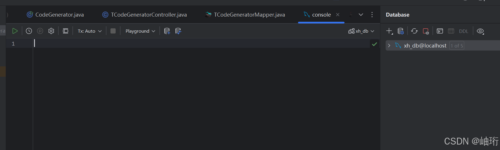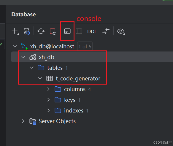 如下选中xh_db、tables、t_code_generator三者其一即可显示上方console小图标