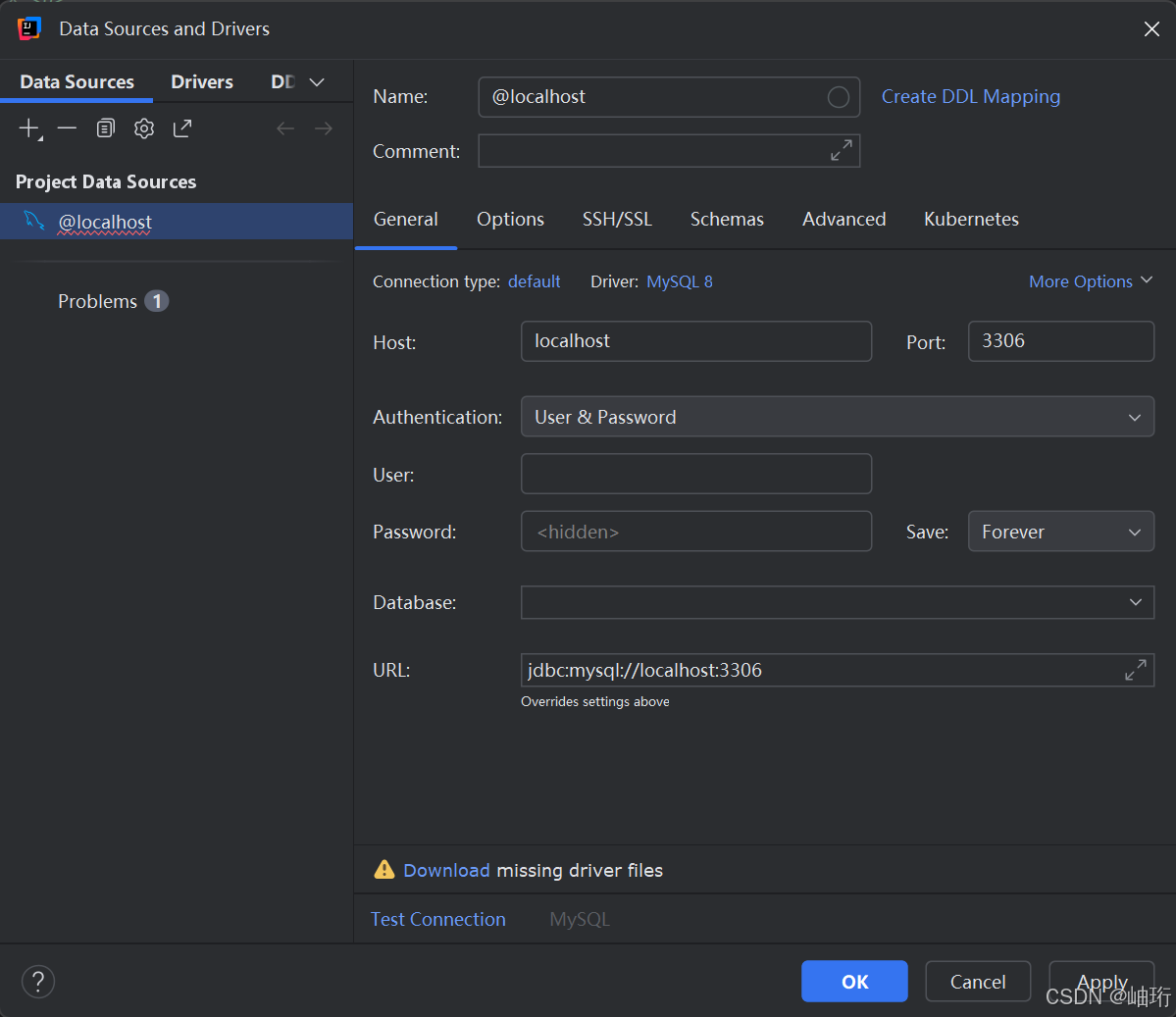 看到上图中下方的黄色感叹号标志了吗,Download missing driver files 表示没有安装数据库驱动