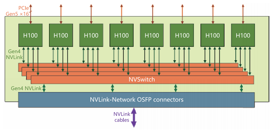 以 NVIDIA 的 HGX H100 8-GPU 服务器为例:每张 H100 GPU 都通过多个 NVLink 端口连接到 4 个 NVSwitch 上。NVSwitch 是一种无阻塞交换机,可以把所有 8 张 GPU 全部互联起来。这样一来,无论哪两张 GPU 之间通信,都能实现高达 900GB/s 的双向速度。换句话说,在服务器内部,GPU 之间的数据传输几乎没有障碍。