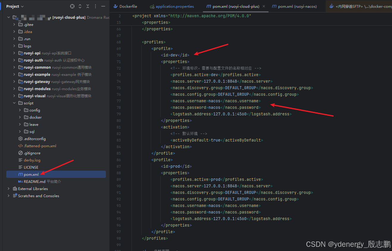 如果你想修改nacos的默认用户名和密码的话,打成jar包前,先去根目录pom文件中,修改相关配置(下图中因为我们是配置测试开发环境的nacos,所以选择id为dev这里的进行修改,可以将ip地址换成公网ip)
