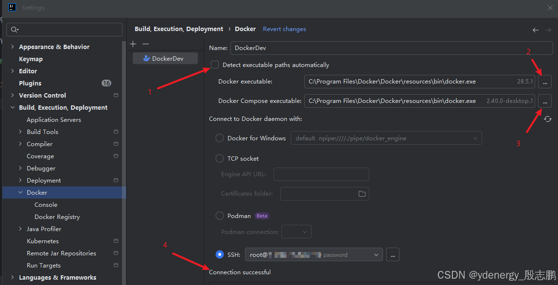 回到idea,在settings中的docker取消勾选Detect executable paths automatically,配置Docker executable和Docker Compose executable为上图中的docker.exe