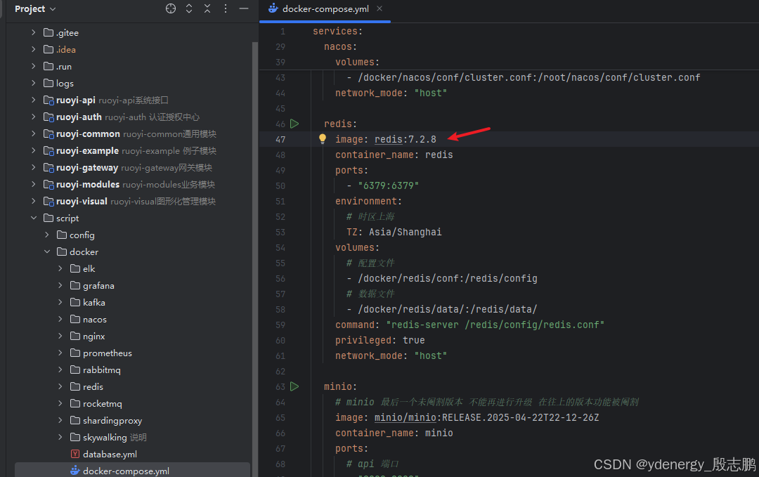 上图中几个基础服务的container_name和服务名称一致均已经指定,mysql,redis,minio,nginx-web,我们进入docker文件夹下(和docker-compose.yml同级目录)通过命令启动即可