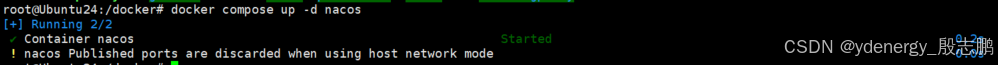 可以发现,这几个容器都提示Published ports are discarded when using host network mode,这是因为我们的docker-compose.yml文件中,指定network_mode: “host”,也就是直接绑定到宿主机的端口上,而我们的命令是端口映射命令,自然是冲突的。就是想要告诉大家,现在这些容器启动是直接在宿主机上绑定这个端口,而不是在容器内部。-d参数是后台运行。