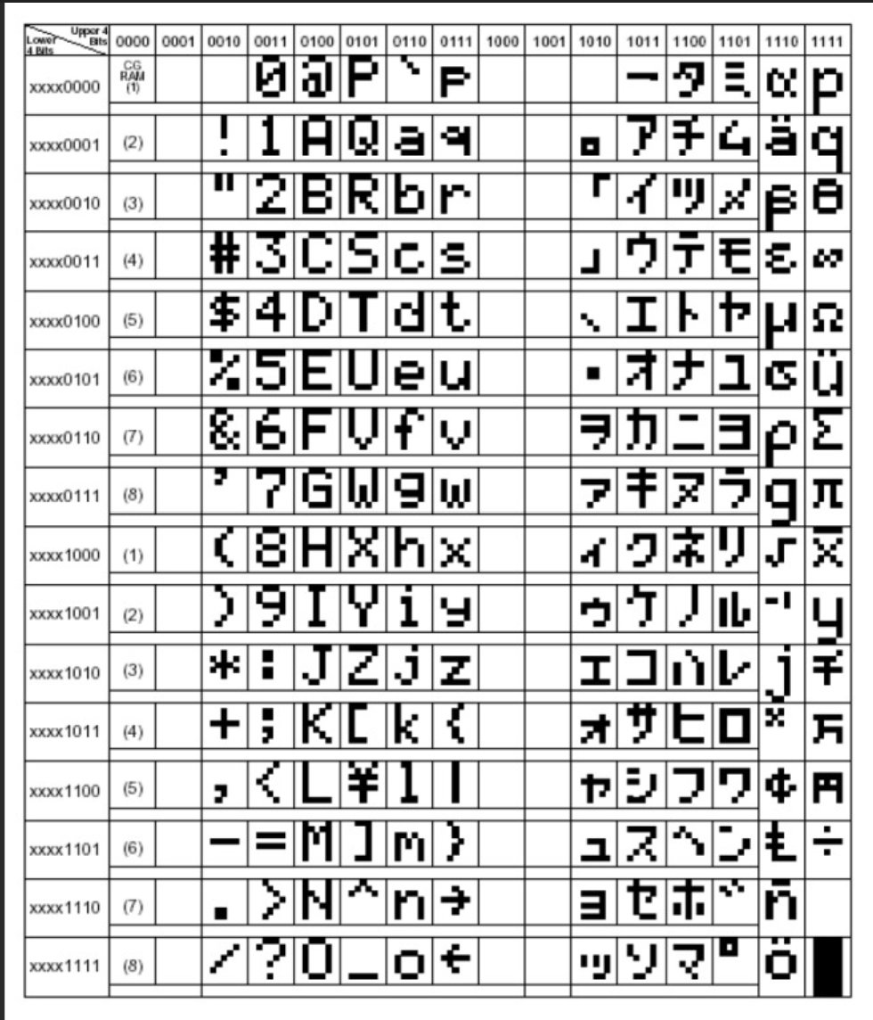 CGRAM预先把240个常用字符对应的高低压信号存起来,并且用ASCII码作为这些信号的索引。比如显示“B”,我们向数据引脚输入0100 0010,对应于下图的“B”(注意最上一行是高四位,最左一行是低四位)