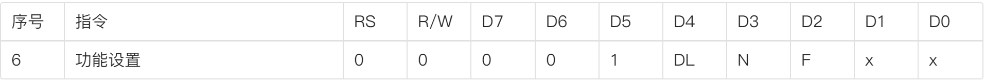 DL置1,数据接口宽度为8;N置1,显示两行字符;F置0,点阵大小为5*7
