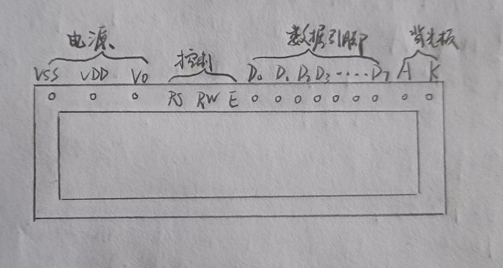 背光板引脚:A、K,这部分与电源引脚一样,不需要在代码中专门设定,只是控制背光板亮灭。