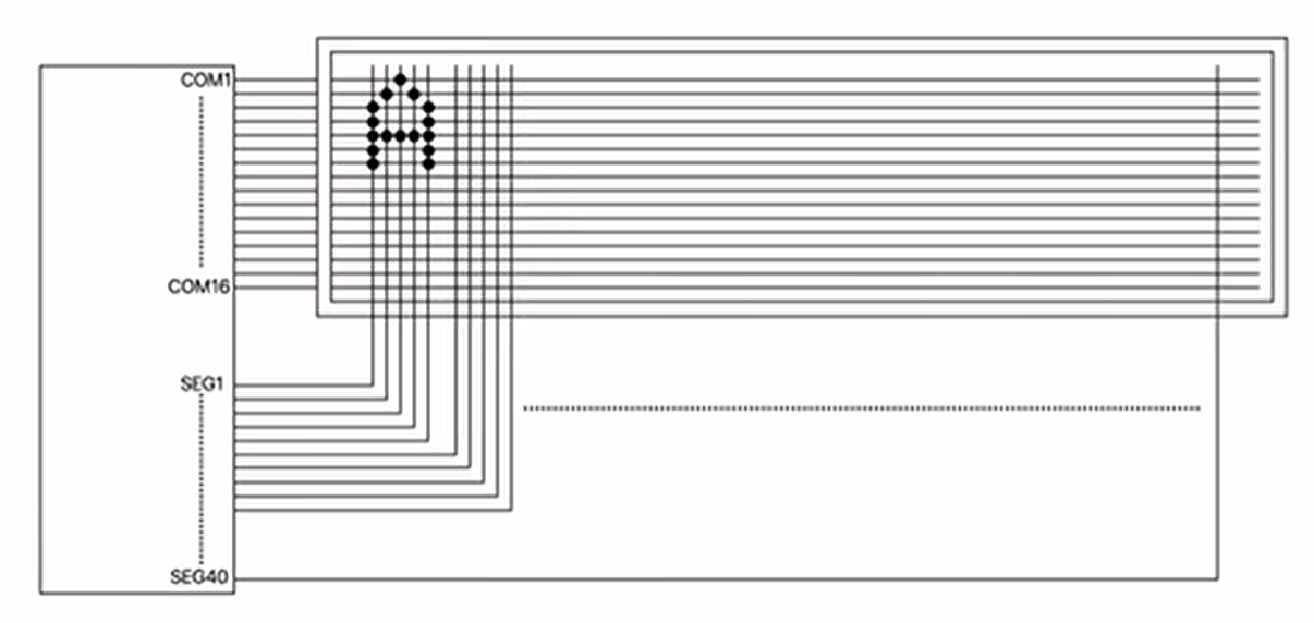 HD44780U有16个COM口和40个SEG口,分别连接字符区域的行方向和列方向。这样,两排字符的行方向通过复用,16个COM口是完全足够的,但是列方向需要16*5=80个引脚,而HD44780U只有40个SEG口,剩下的40个引脚就管不了了吗?