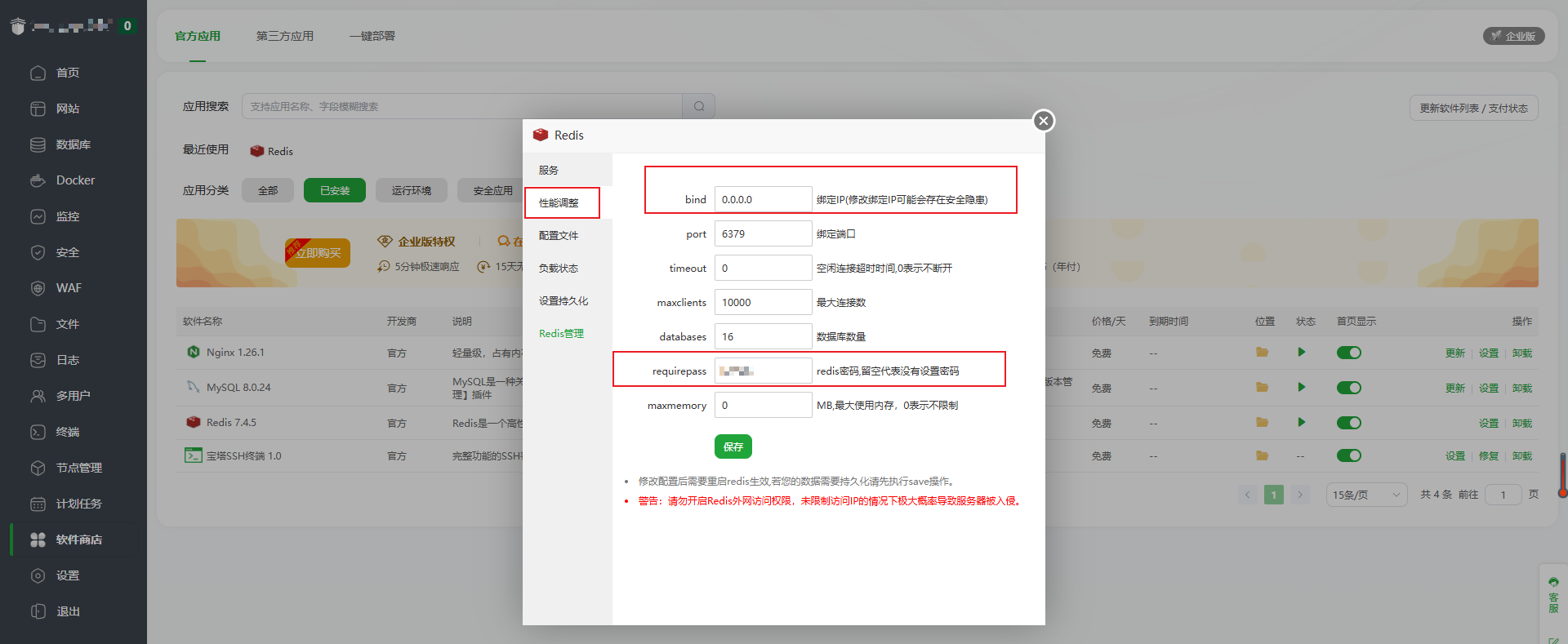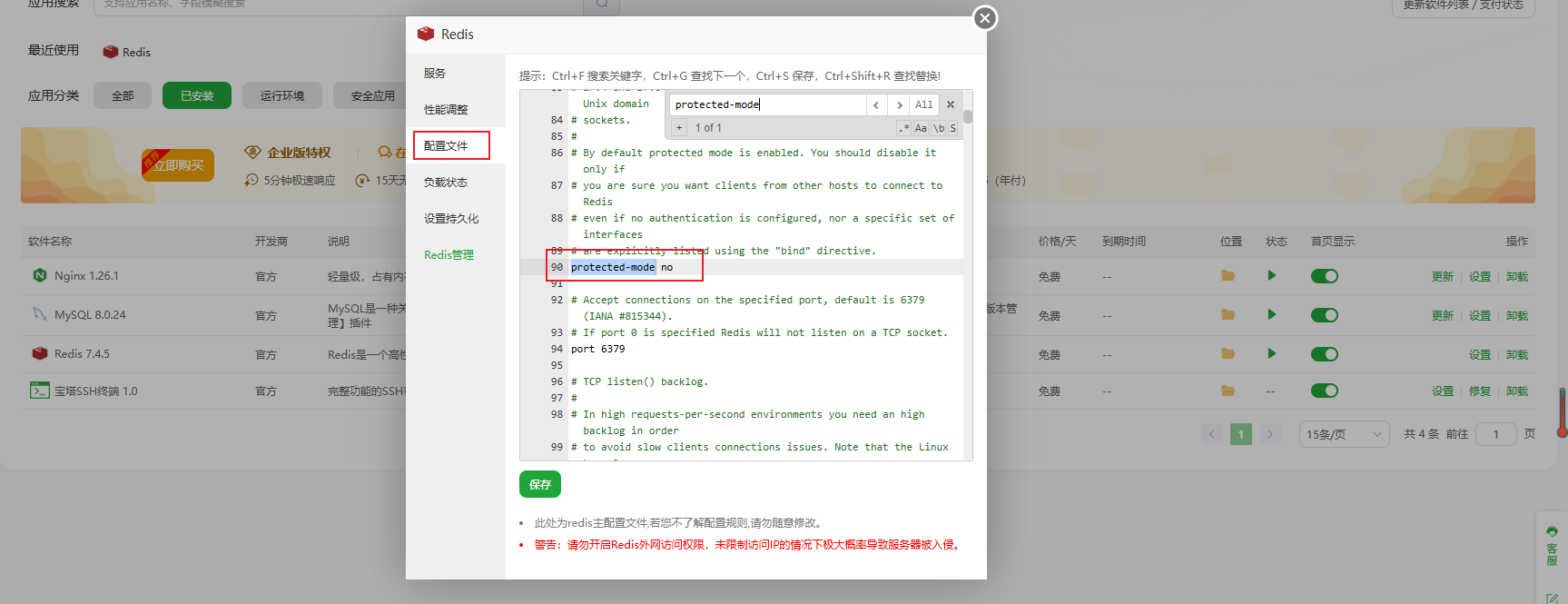 2.修改配置文件中的 protected-mode:protected-mode是Redis 3.2版本后引入的一种安全保护机制。当开启保护模式时(默认值为yes),如果Redis服务器没有明确绑定到特定IP地址且没有设置密码,那么它只会接受来自本地回环地址(127.0.0.1和::1)的连接,拒绝来自外部网络的连接请求。