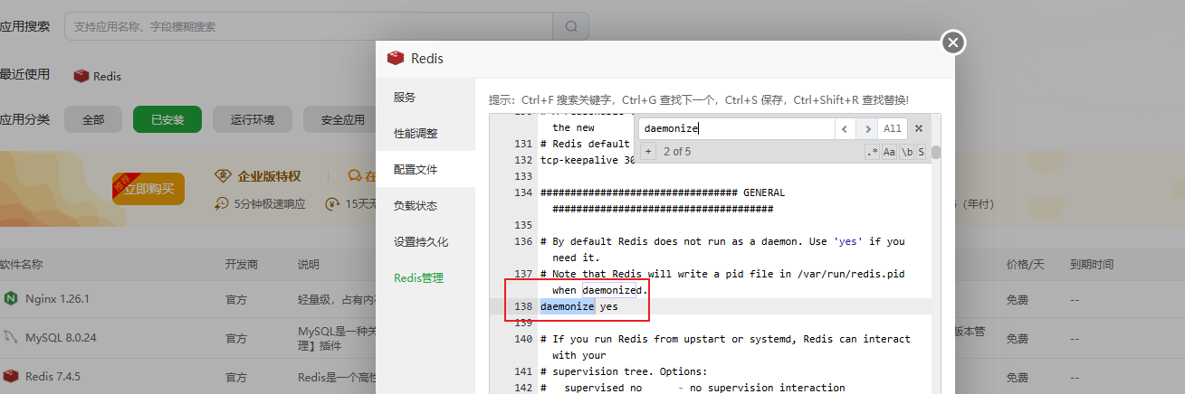 3. 修改daemonize:控制Redis是否以守护进程(后台进程)方式运行。