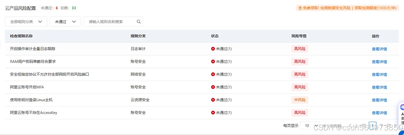 对于安全体检的介绍,官方的解释比较简单,容易理解,这里我直接引用官方介绍:【安全体检是阿里云为用户提供的免费安全检测工具。安全体检服务调用云安全中心、配置审计中免费的安全检测能力,并汇总检测结果,涵盖病毒攻击、风险配置、服务器漏洞三方面。定期使用安全体检工具,可以帮助您及时发现风险问题,助您提升云上安全水平。】可以简单理解为你电脑安装的安全管家,定期扫毒杀毒等。