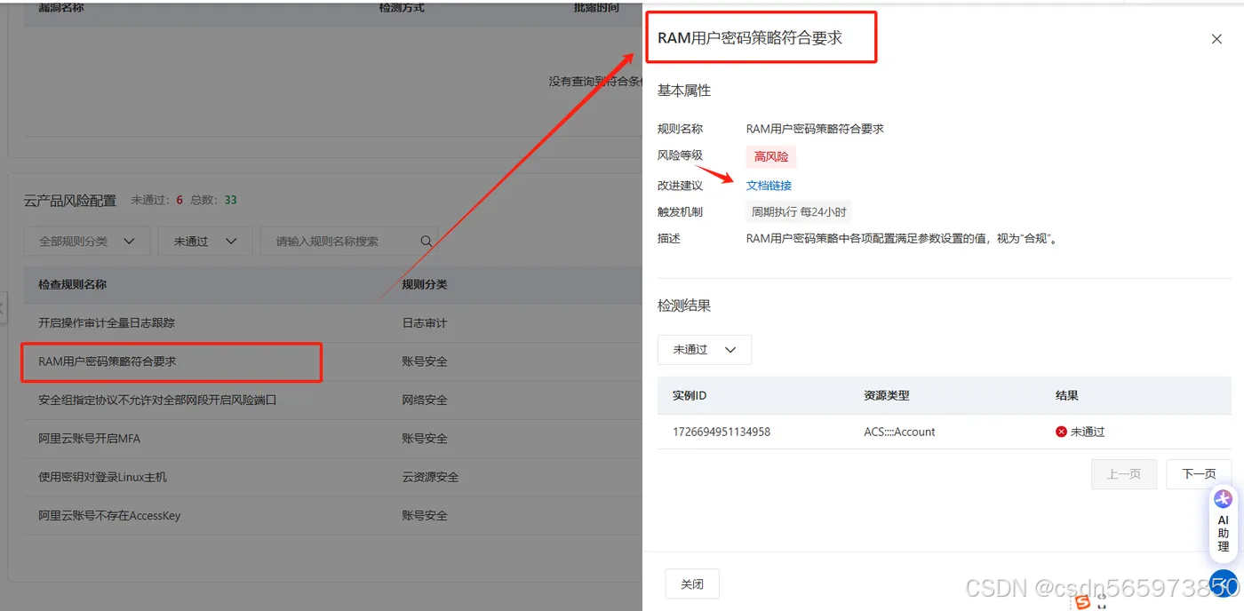 这里我有个疑问,就是说我已经修复了【RAM用户密码策略符合要求】,但是回到云产品风险配置,这里还在,也没有【重新检测】按钮,这里没办法验证自己的修复是不是真的满足安全体检的要求,但是已经是按照文档的要求进行了修复,应该是没有问题了