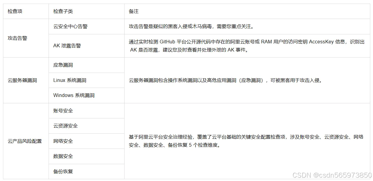 体检摘要主要涉及:攻击告警、云服务器漏洞、云产品风险配置 等的检测