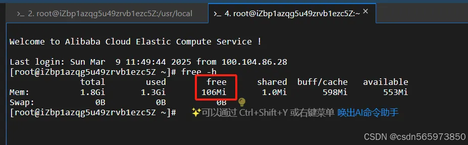 我们重新开一个窗口来查看一下剩余内存的情况,可以看到这里已经没有多少内存剩余了,按正常道理,安全体检应该可以检测出 linux 服务器漏洞了