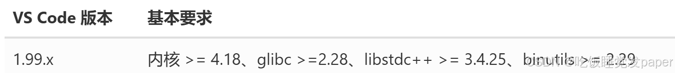 从 VS Code 版本 1.99(2025 年 3 月)开始,VS Code 分发的预构建服务器仅与基于 glibc 2.28 或更高版本的 Linux 发行版兼容。例如,这些发行版包括 Debian 10、RHEL 8 或 Ubuntu 20.04。