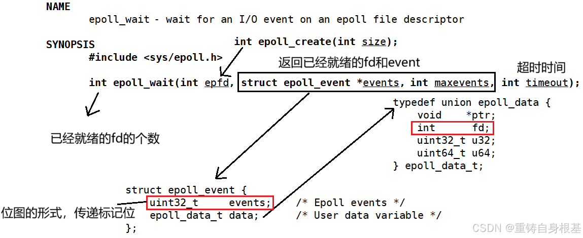 - 其实epoll_ctl参数中包含的文件描述符sock是作为键值key用于新增或找到红黑树中的节点的,而此时这个struct epoll_event中既包含fd也包含event事件,那么将来event_wait获取的数组中的对象epoll_event,这个epoll_event才可以让我们得知是哪个fd就绪了,fd上的哪个event就绪了