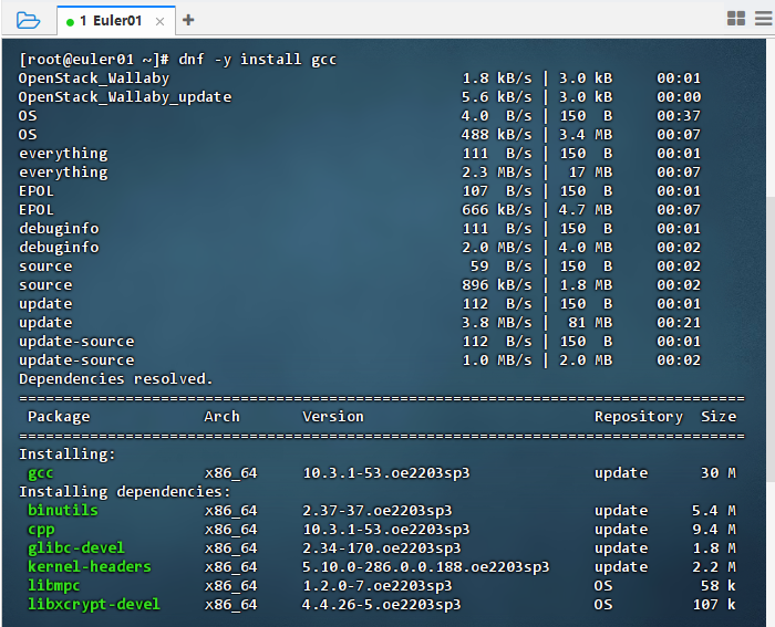 2、安装 GCC 编译器(该命令会自动下载并安装 GNU 编译器集合(GCC),包括编译器核心文件与相关依赖包。安装过程中,dnf 将显示依赖关系解析与安装进度)
