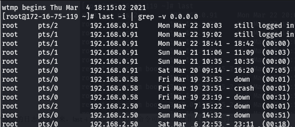 日志会把每个用户登录的日志记录下来,last -i | grep -v 0.0.0.0命令可以筛选出非本地登录的日志,可以看到有两个非本地ip的用户登录了服务器。