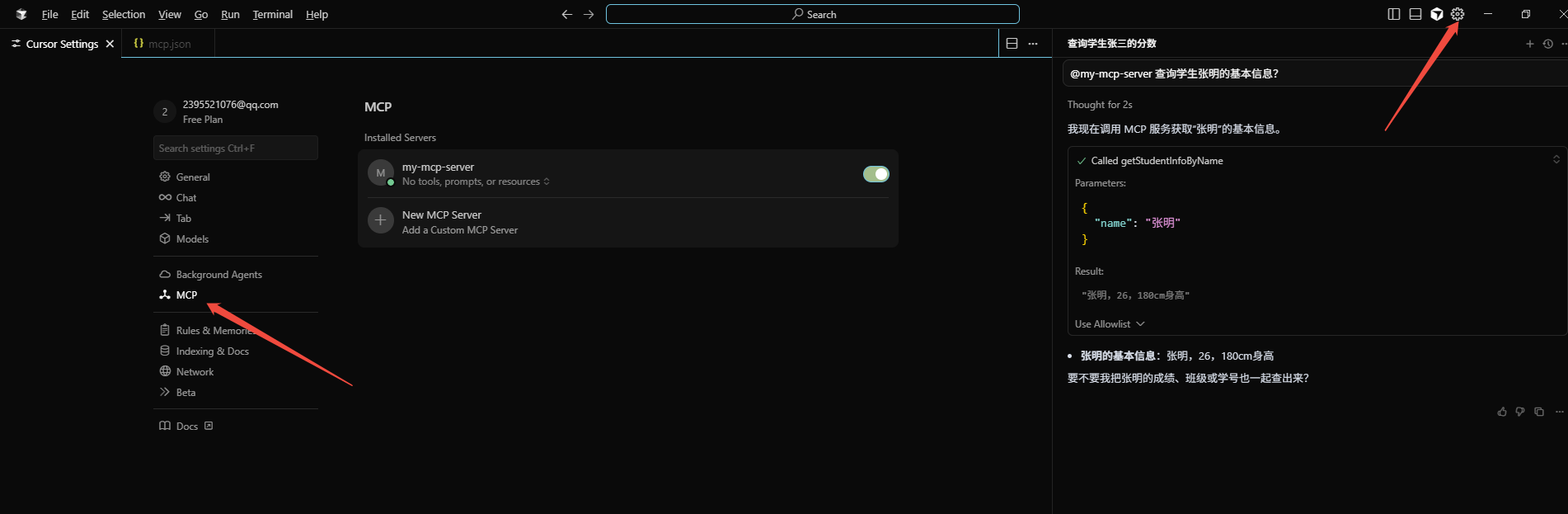 如:@my-mcp-server 查询学生张三的基本信息?,其中my-mcp-server为mcp.json中配置的mcp服务的名称,该名称对应后端配置文件中的spring.ai.mcp.server.name