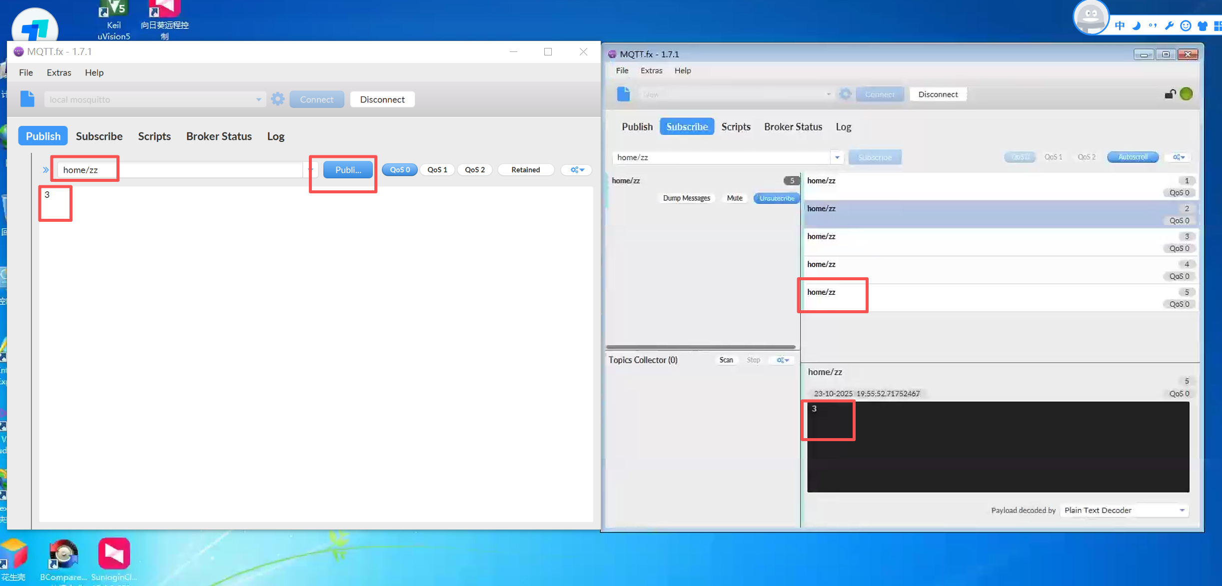 配置相同的话题home/zz,输入3,点击publish。另一台电脑的mqtt.fx接收到话题的数据3。