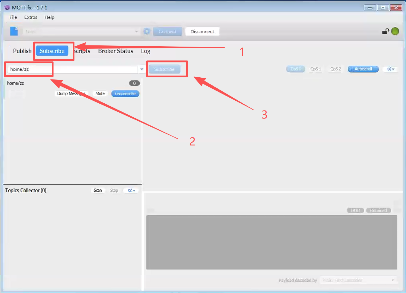 设置订阅,选中Subscribe,输入home/zz,订阅。