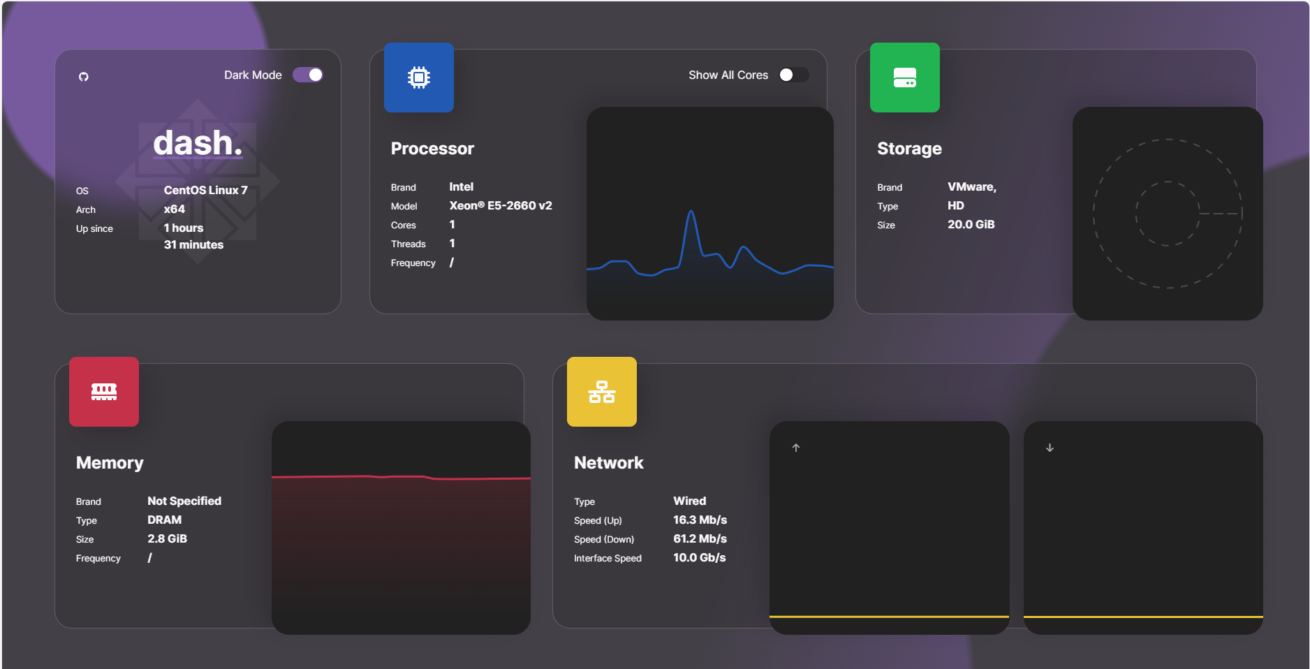 DashDot 是一款轻量级的服务器监控工具,能实时显示 CPU、内存、磁盘、网络等状态,以直观的图表呈现,适合管理小型服务器或 NAS 的用户。它占用资源少,界面简洁,还支持明暗主题切换,优点是轻便又好用。