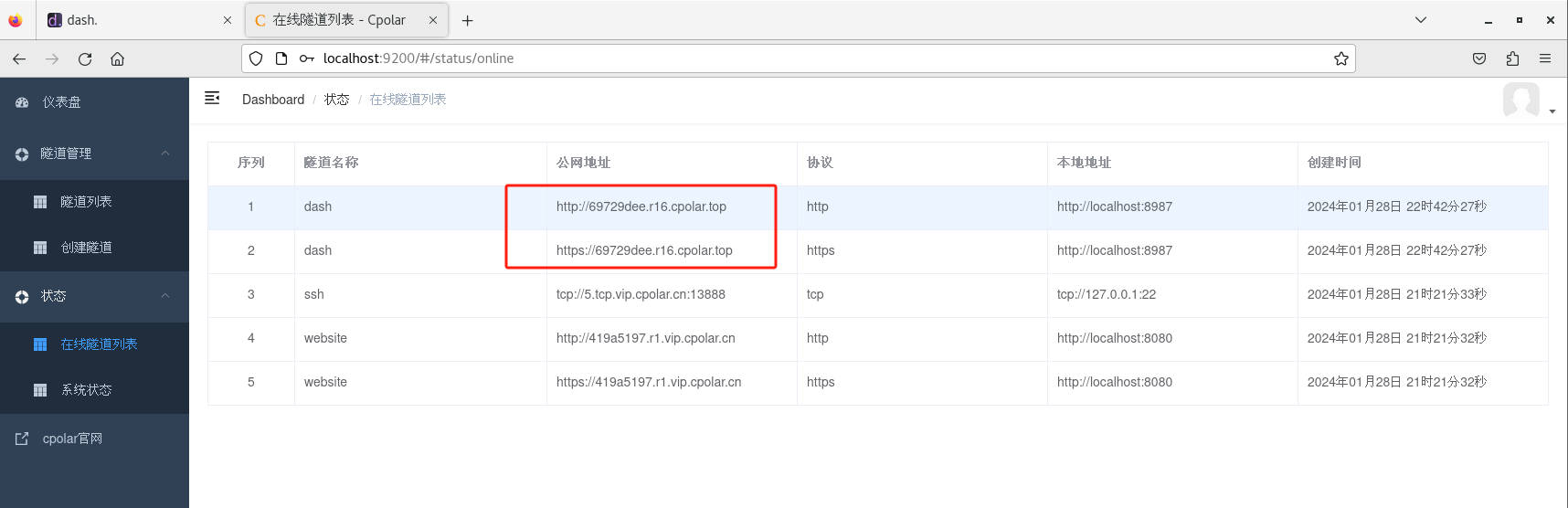 隧道创建成功后,点击左侧的状态——在线隧道列表,查看所生成的公网访问地址,有两种访问方式,一种是http 和https