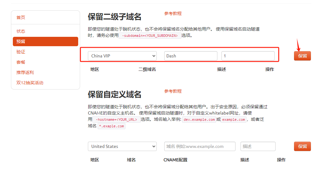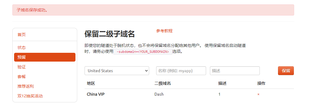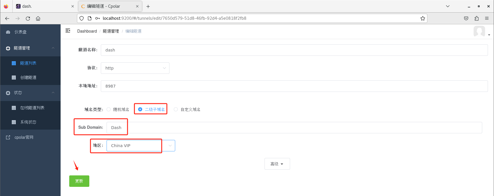 修改隧道信息,将保留成功的二级子域名配置到隧道中