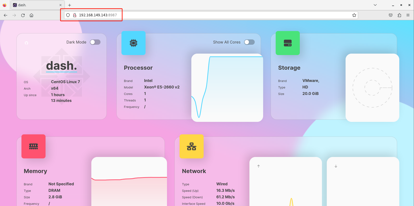 访问地址:http://192.168.149.143:8987,将IP替换为自己服务器IP地址,在浏览器可以访问Dashdot服务器仪表盘首页。可以看出它识别出我的CPU ,内存,硬盘等信息都还是非常准确的